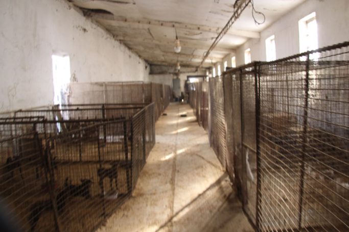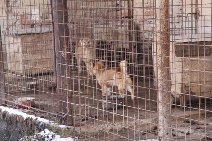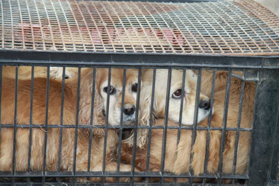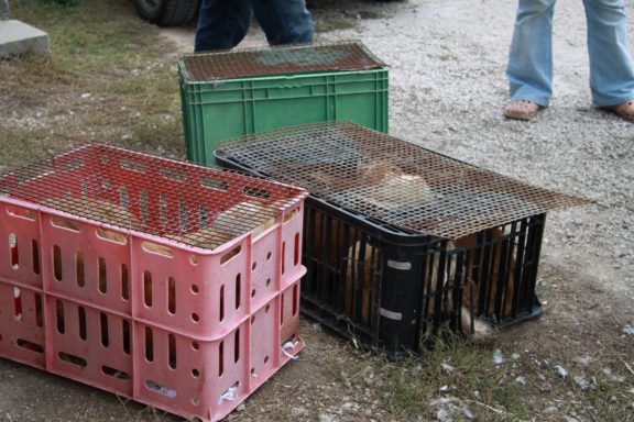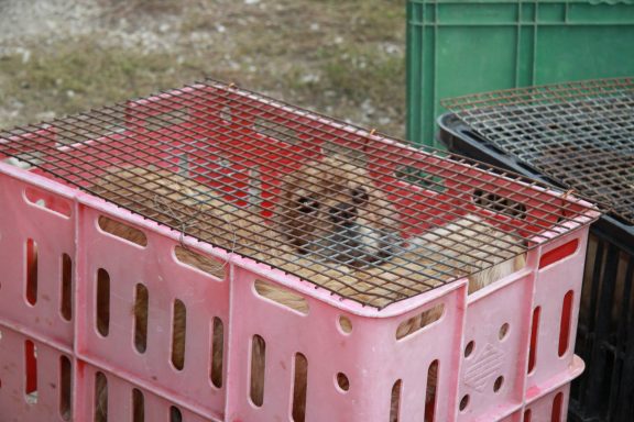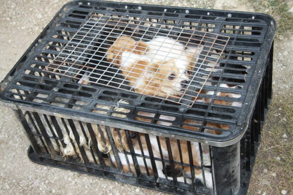 Aussortierte Vermeherhunde werden in Boxen verstaut und zum Tierheim gebracht